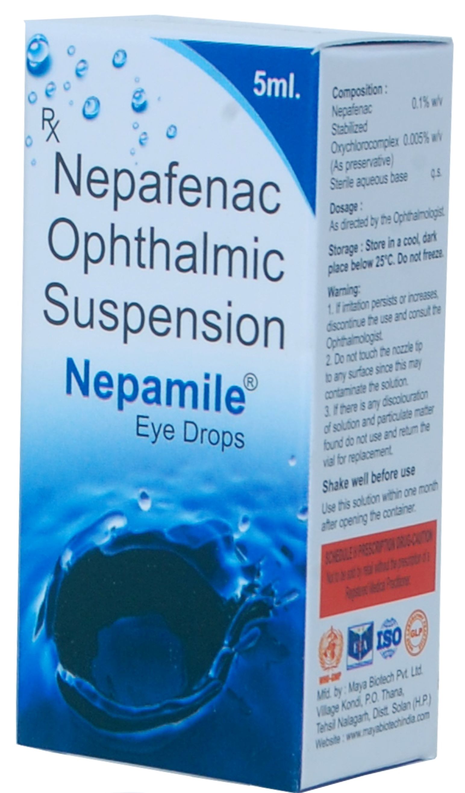 Nepafenac is a nonsteroidal anti-inflammatory drug, usually sold as a prescription eye drop 0.1% solution or 0.3%